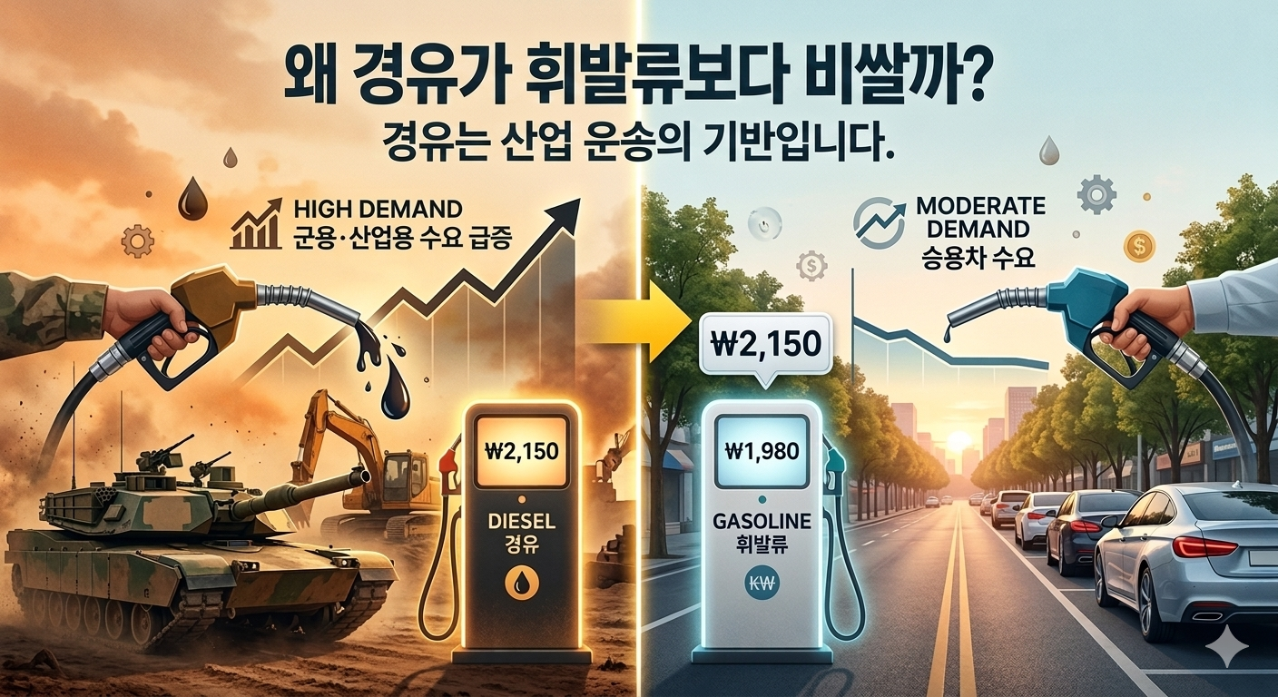 - 수요의 경직성: 휘발유는 개인 승용차용이라 비싸면 운행을 줄일 수 있지만, 경유는 산업·물류 현장에서 '반드시 써야 하는' 기름이라 가격이 올라도 수요가 잘 줄지 않아 하방 경직성이 강합니다.