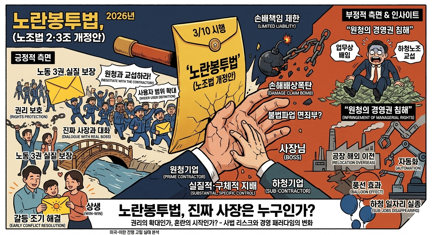 2026년 3월 10일, 드디어 [노란봉투법(노조법 2·3조 개정안)]이 시행되었습니다. 시행 첫날부터 전국의 하청 노조들이 원청 기업을 상대로 무더기 교섭을 요구하며 산업 현장에 긴장감이 감돌고 있는데요.
